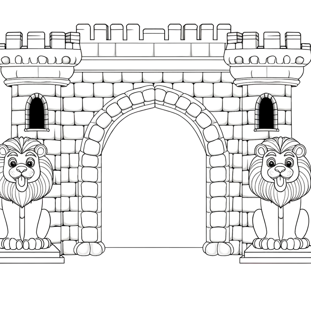 This enchanting coloring page features a cartoon-style castle entrance flanked by impressive stone lion statues standing guard. Perfect for young artists who love medieval fantasy themes and want to bring this magical gateway to life with their favorite colors.