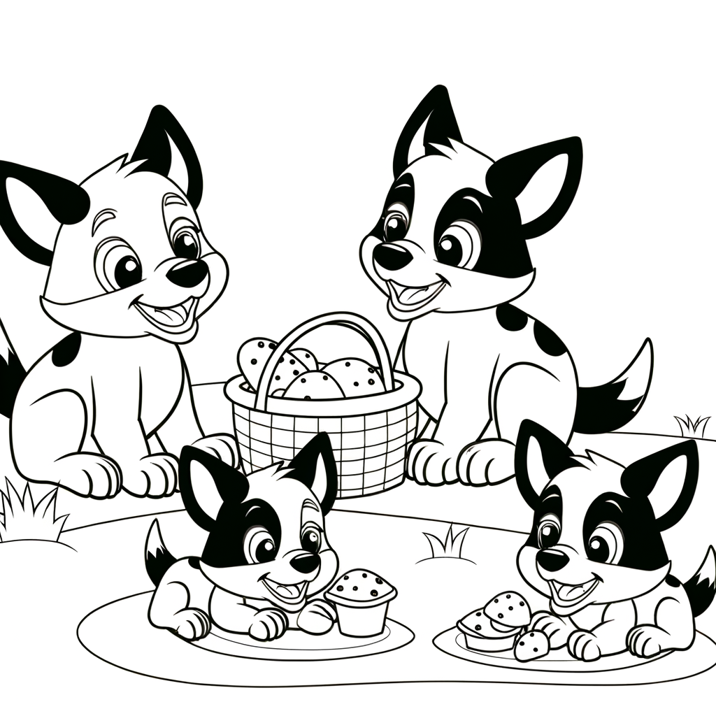 Delight kids with this adorable black and white coloring page featuring a cute cartoon blue heeler puppy family enjoying a picnic. Designed with thick, clean outlines and a white background, it's perfect for young artists looking for a simple and fun activity.