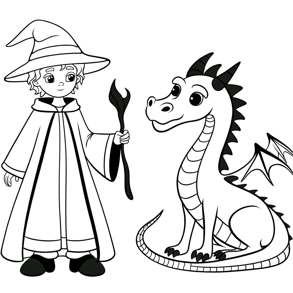 This coloring page features a wise wizard accompanied by his faithful dragon companion, ready to spark imagination and creativity in every child. Perfect for a magical artistic adventure.