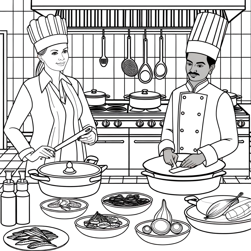 Udforsk din kreativitet med vores 'Kok laver mad i køkkenet' malebog. Denne dejlige illustration viser en kok, der forbereder et lækkert måltid, perfekt til unge kommende kokke.