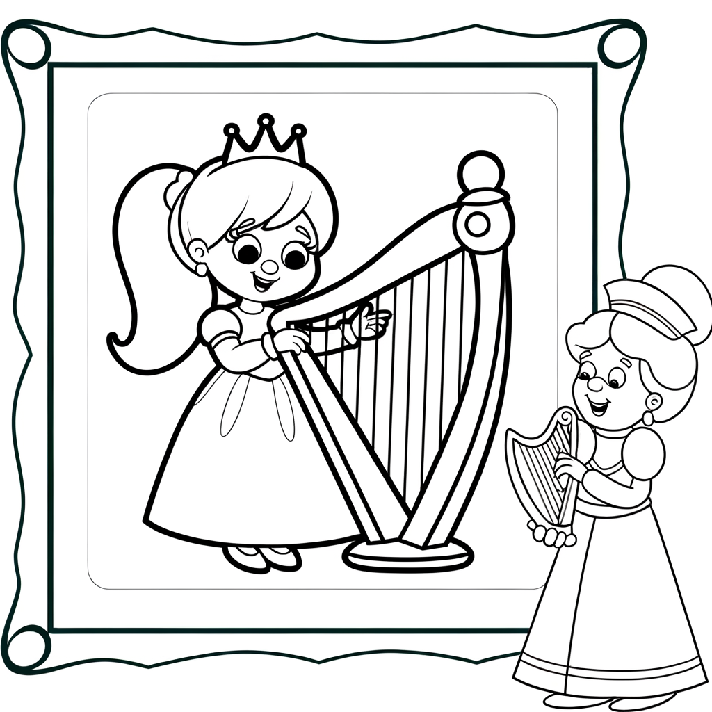 Denne dejlige farvelægningsside viser en tegneserie-prinsesse, der tager harpetimer med sin tålmodige musikllærer. Børn kan bringe denne musikalske scene til live med deres yndlingsfarver, mens de lærer om klassiske instrumenter og glæden ved musikundervisning.