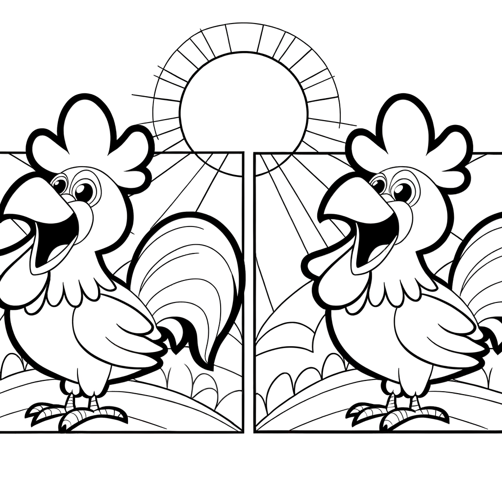 Diese bezaubernde Malvorlage zeigt einen cartoonhaften, stolzen Hahn, der energetisch bei Sonnenaufgang kräht. Eine perfekte Wahl für junge Künstler, um ihre Kreativität mit lebhaften Farben auszuleben. Erwecke diese lebendige Morgenszene zum Leben, während du deine künstlerischen Talente erkundest.