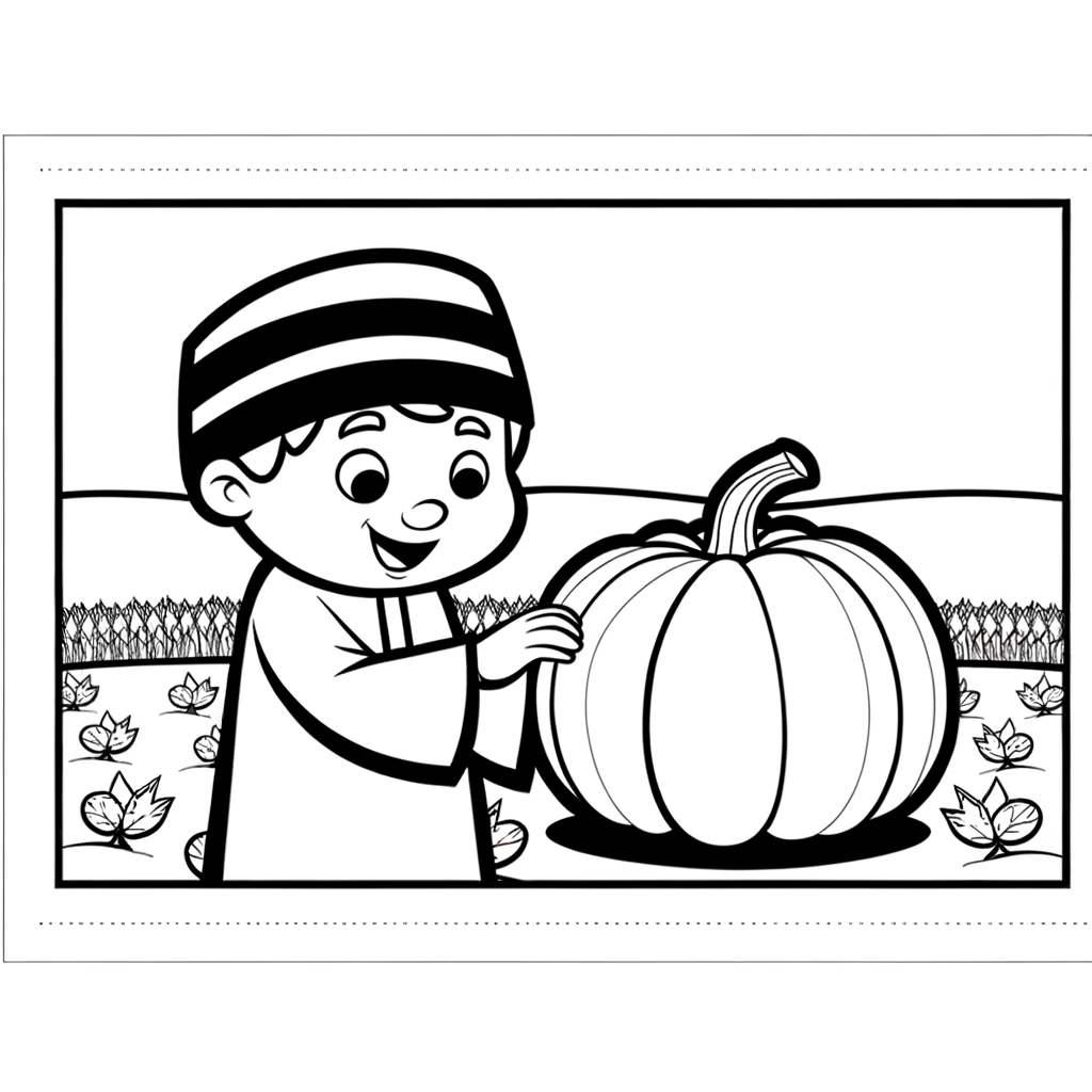 Diese bezaubernde Malvorlage zeigt ein Cartoon-Kind, das ein Kürbisfeld erkundet und den perfekten Kürbis auswählt. Das Design enthält dicke schwarze Konturen, die es jungen Künstlern erleichtern, auszumalen und diese klassische Herbstaktivität zu genießen.