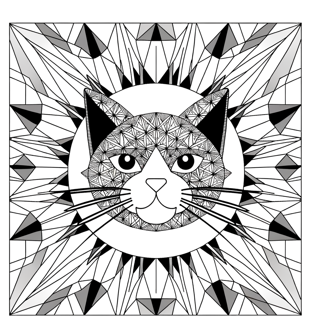 Explorez ce mandala de chat détaillé conçu avec des motifs de moustaches complexes. Idéal pour la détente et pour laisser libre cours à votre créativité, cette page à colorier est parfaite pour les enfants et les adultes qui aiment les chats et les mandalas.