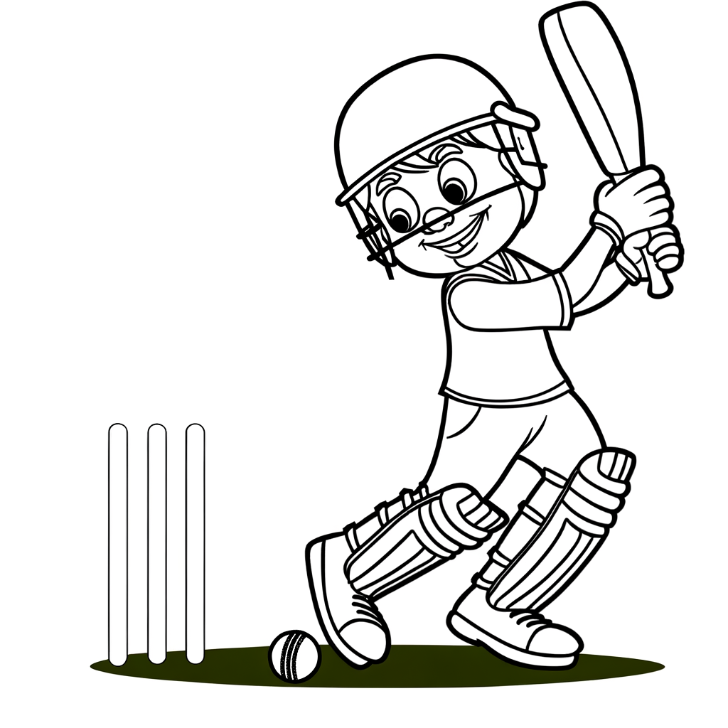 Cette page à colorier amusante au style cartoon présente un batteur de cricket en action, balançant sa batte pour frapper la balle. Parfait pour les jeunes fans de cricket et les passionnés de sport qui souhaitent pratiquer leurs compétences en coloriage tout en apprenant sur ce sport populaire.