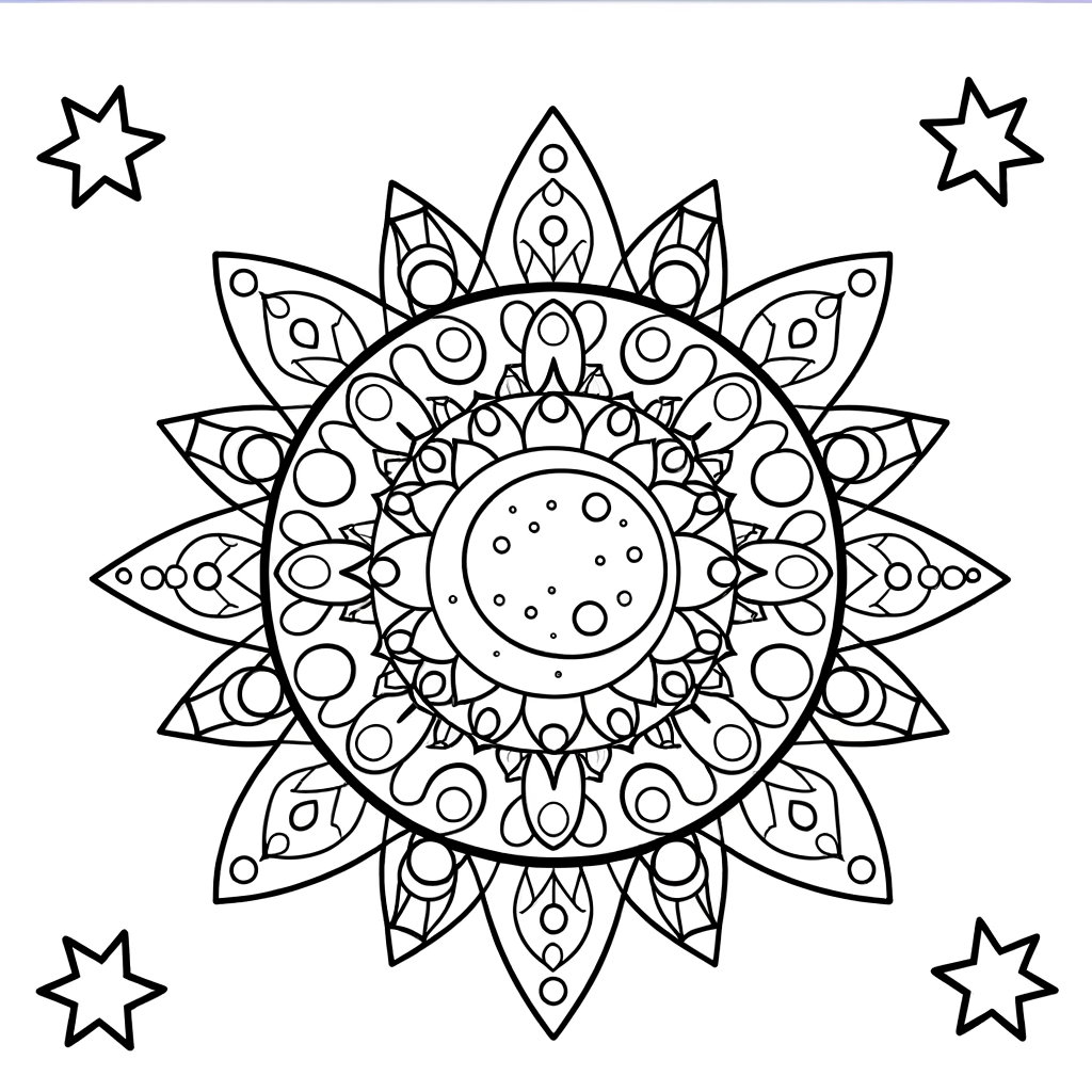 This enchanting mandala features a beautiful celestial design with moon and stars motifs woven throughout intricate geometric patterns. Perfect for meditation and relaxation, this detailed coloring page offers hours of creative enjoyment for both children and adults.