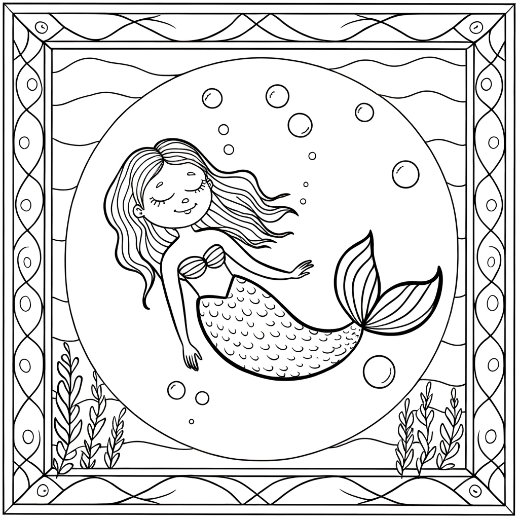 Cette page à colorier enchanteresse présente une douce sirène cartoon flottant sereinement les yeux paisiblement fermés. Le design capture un moment de méditation tranquille sous l'eau, parfait pour créer une expérience de coloriage apaisante qui favorise la détente et la créativité.