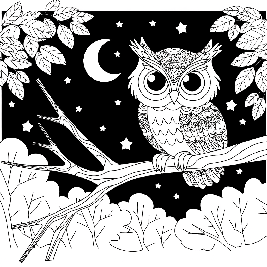 Laat je creativiteit de vrije loop met deze heerlijke kleurplaat met een schattige uil die op een boomtak zit onder de serene nachtelijke lucht. Ideaal om te ontspannen en de verbeelding te prikkelen, brengt deze pagina de charme van de nachtelijke dierenwereld naar voren.