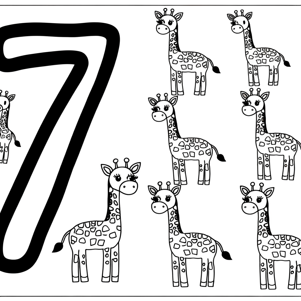 Ontdek onze kleurplaat met zeven giraffen die het getal 7 vertegenwoordigen. Perfect voor creatieve kinderen die van kleuren houden!
