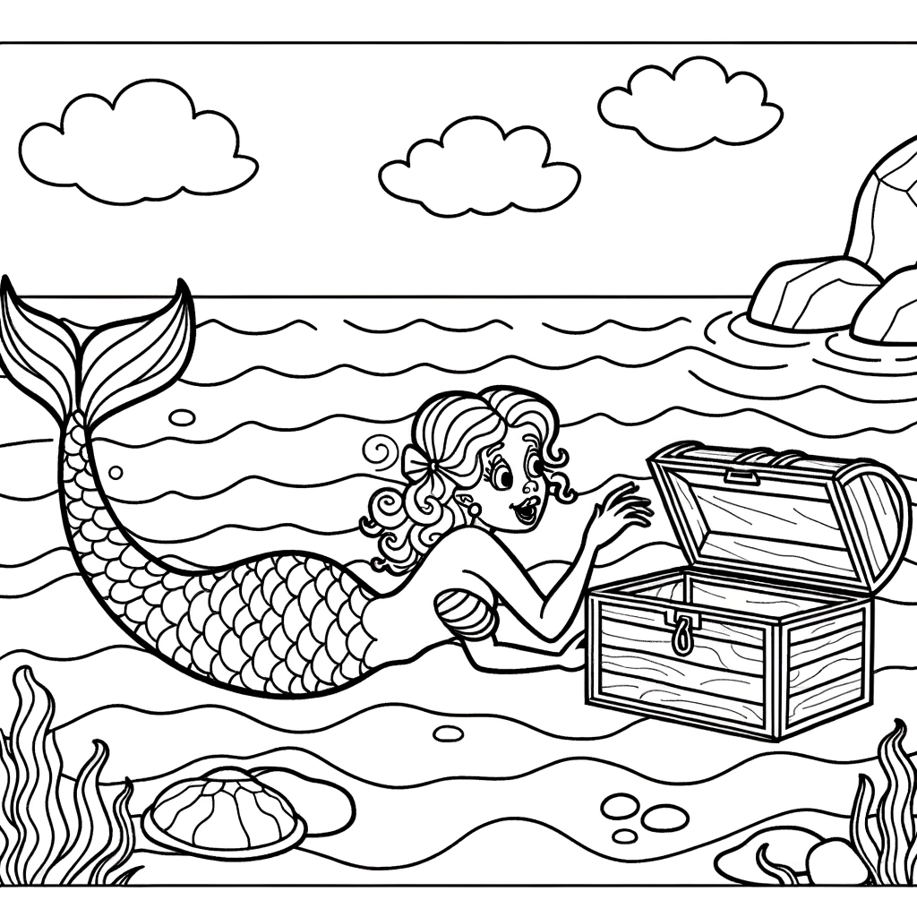 Denna underbara målarbild visar en tecknad sjöjungfru som upptäcker en magisk skattkista på havets botten. Barn kommer att älska att ge liv åt detta undervattäventyr med sina favoritfärger medan de utforskar djuphavets mysterier.