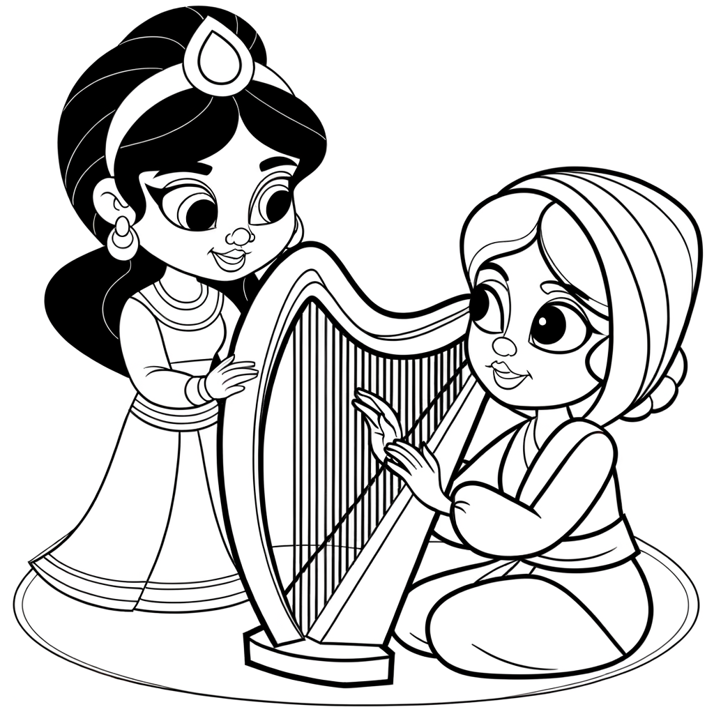This delightful coloring page shows a charming cartoon princess taking a harp lesson with her friendly music teacher. Children can color this magical scene while learning about music and musical instruments.