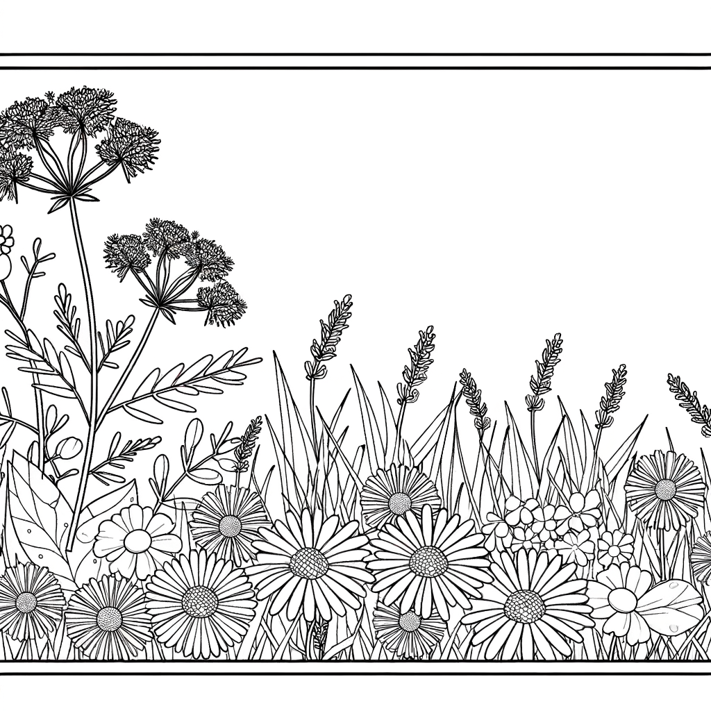 Denna förtrollande färgläggningssida visar en livlig äng med vildblommor fylld med olika typer av blommor. Barn och vuxna kan njuta av att färglägga olika blomarter, stjälkar och blad samtidigt som de lär sig om naturens vackra mångfald.